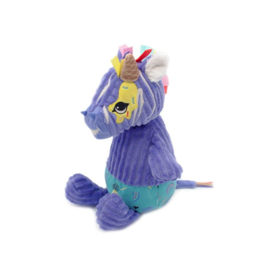 Roztomilý plyšák v podobě zebry, v krásné fialové barvě, je originálním dárkem k jakékoliv příležitosti. Úžasně heboučké plyšové zvířátko ušité z měkoučkého manšestru, ozdobené barevnými stuhami, je ideálním společníkem do postýlky nebo kolébky, do kočárku i na cesty. Plyšovou zebrou v dárkové krabičce a pokladničce můžete obdarovat miminko i větší slečnu..