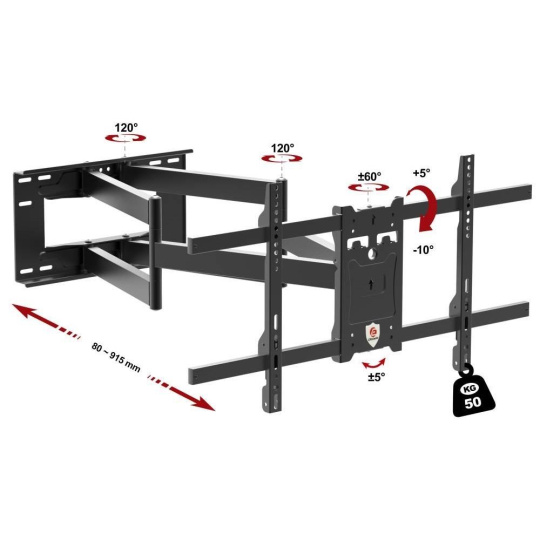 Poctivý držák na televize Ergosolid ONYX-30 Kvalitní nástěnný držák na Tv 43-90", výsuvný 80-915mm, otočný +/-65°, náklon +5°/-10°, korekce roviny +/-5°, VESA 200x100 až 800x400, nosnost 50kg Nástěnný držák poctivé konstrukce pro spolehlivé zavěšení všech typů a značek televizí. Držák Vám umožní televizi nastavit od zdi do vdáleností v rozmezí 80mm až 915mm. Otáčení do stran bude možné minimálně o 60° na každou stranu, náklon je možný v rozmezí +5°až -10°. Pro usnadnění instalace má držák možnost korekce roviny obrazovky až o 5° na každou stranu. Celá konstrukce držáku je vyrobena z poctivé ocely a ani při maximálním vysunutí a maximálním zatížení nevznikají žádné vůle a nedochází k prověšení ramen. Instalační nástěnná plocha s rozměry 455x255mm je dostatečně velká pro spolehlivé uchycení na zeď a výborné rozložení celkové hmotnosti na větší plochu. Držák podporuje VESA standardy 200x100 až 800x400 a zavěsit na něj můžete televize s hmotností až 50kg. Barevné provedení je černé. Na držák poskytujeme záruku 5 let. Nástěnný extra dlouhý výsuvný držák poctivé konstrukce na televize 43-90" Ergosolid ONYX-30 Technické údaje: nosnost 50kg podporuje VESA 200x100 až 800x400 ideální na televize s úhlopříčkou 43" až 90" nastavitelná vzdálenost od zdi 80mm až 915mm otáčení na obě strany až +/- 60° naklápění dolů až o 10° nebo nahoru až o 5° korekce roviny obrazovky až +/- 5° instalační plocha o rozměrech 455x255mm vynikající kvalita ocelová silnostěnná konstrukce instalační materiál je součástí balení barevné provedení černé záruka 5 let Kvalitní konstrukce a opravdu rozsáhlá možnost polohování jsou předností televizního držáku Ergosolid ONYX-30 Tv držák Ergosolid ONYX-30 podporuje tyto VESA standardy: VESA 200x100 VESA 200x200 VESA 300x200 a 200x300 VESA 300x300 VESA 400x200 a 200x400 VESA 400x300 a 300x400 VESA 400x400 VESA 600x400 VESA 800x400 Na televizní držák Ergosolid ONYX-30 můžete zavěsit všechny typy, značky a velikosti televizorů, které mají hmotnost maximálně 50kg a které podporují kterýkoliv z výše uvedených VESA standardů. Univerzální držák na LCD LED plazma OLED QLED televize 43-90" Ergosolid ONYX-30 V balení naleznete tento instalační materiál: šrouby M4x14mm 4ks šrouby M6x14mm 4ks šrouby M6x30mm 4ks šrouby M8x20mm 4ks šrouby M8x45mm 4ks malé distační válečky 4ks velké distanční válečky 4ks univerzální podložky 4ks podložky na šrouby 5ks vruty do hmoždinek 8x60mm 5ks hmoždinky O10x50mm 5ks stahovací pásky na suchý zip 2ks (fixace kabeláže na držáku) Televizní držák poctivé konstrukce a vynikající kvality Ergosolid ONYX-30 dodáváme včetně instalačního materiálu Držáky Tv Ergosolid ONYX-30 poskytují velkou variabilitu polohování obrazovky, vynikající zpracování a naprosto bezpečné zavěšení televizoru za dostupnou cenu. Tyto držáky vydrží opravdu mnoho let bez nutnosti jakýchkoliv oprav a díky univerzálnosti jsou vhodné i v případě zakoupení nové televize. Stanou se součástí Vašeho domova..