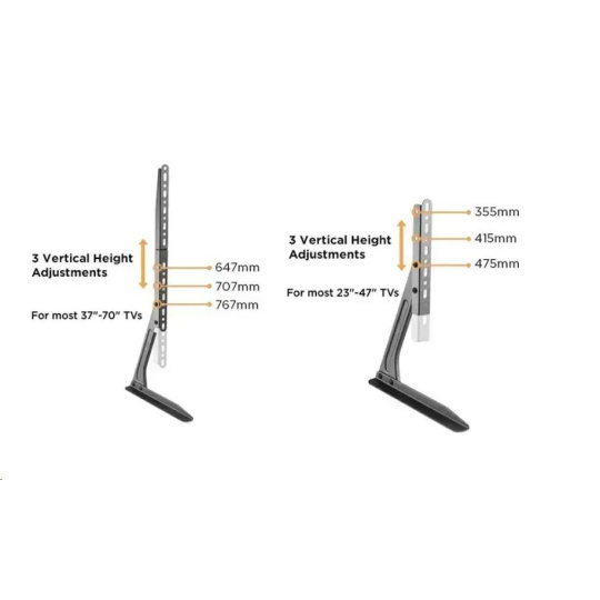 Nožky na televizi s nosností 50kg, na Tv 37" až 65", výškové nastavení Stabilní podstava na televize, univerzální, vhodné na všechny typy, velikosti a značky televizorů s podporou VESA standardu. Výškové nastavení, nosnost 50kg, barevné provedení černé, záruka 3 roky. Balení obsahuje sadu instalačního materiálu. Podstavec na televizi, nožky na Tv Ergosolid Castor 1 Technické údaje: nosnost 50kg podpora VESA standardů 100x100 až 800x500 doporučená úhlopříčka Tv 37" až 65" výškové nastevení 620mm až 683mm šířka podstavců 356mm protiskluzové podložky minimalistický design stabilní, bezpečný materiál ocel instalační materiál barevné provedení černé záruka 3 roky Ergosolid Castor 1 podporuje VESA standardy: VESA 100x100 VESA 200x100 a 100x200 VESA 200x200 VESA 300x100 a 100x300 VESA 300x200 a 200x300 VESA 300x300 VESA 400x200 a 200x400 VESA 400x300 a 300x400 VESA 400x400 VESA 600x400 VESA 800x400 VESA 800x500.