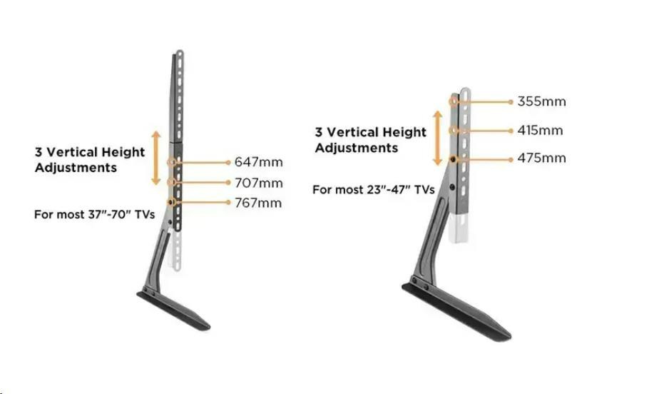 Nožky na televizi s nosností 50kg, na Tv 37" až 65", výškové nastavení Stabilní podstava na televize, univerzální, vhodné na všechny typy, velikosti a značky televizorů s podporou VESA standardu. Výškové nastavení, nosnost 50kg, barevné provedení černé, záruka 3 roky. Balení obsahuje sadu instalačního materiálu. Podstavec na televizi, nožky na Tv Ergosolid Castor 1 Technické údaje: nosnost 50kg podpora VESA standardů 100x100 až 800x500 doporučená úhlopříčka Tv 37" až 65" výškové nastevení 620mm až 683mm šířka podstavců 356mm protiskluzové podložky minimalistický design stabilní, bezpečný materiál ocel instalační materiál barevné provedení černé záruka 3 roky Ergosolid Castor 1 podporuje VESA standardy: VESA 100x100 VESA 200x100 a 100x200 VESA 200x200 VESA 300x100 a 100x300 VESA 300x200 a 200x300 VESA 300x300 VESA 400x200 a 200x400 VESA 400x300 a 300x400 VESA 400x400 VESA 600x400 VESA 800x400 VESA 800x500.