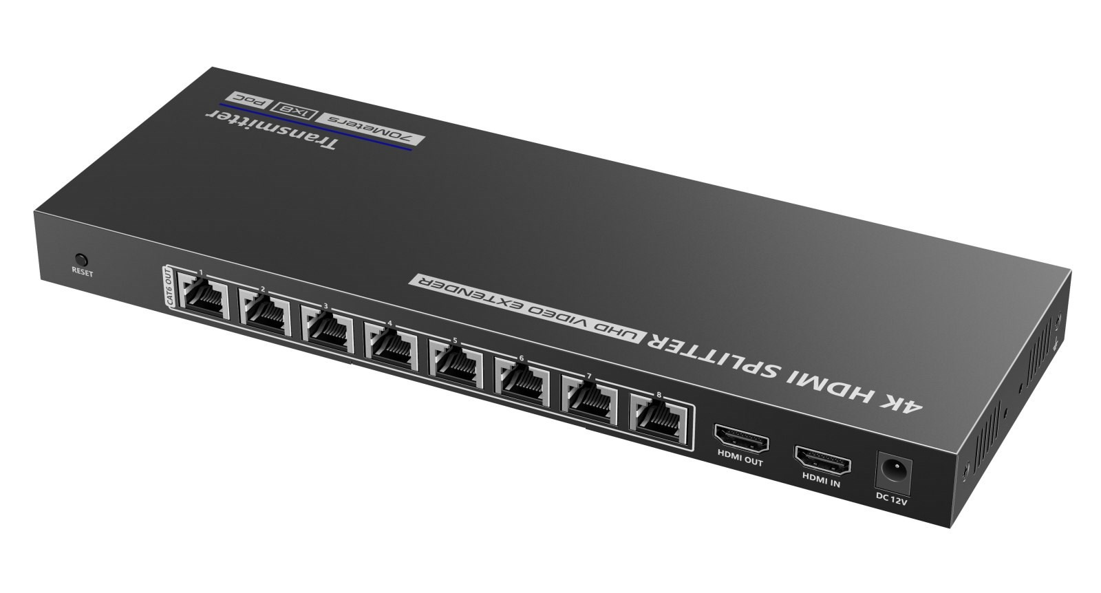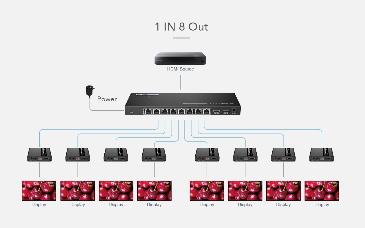 Splitter+extender umožňuje připojit dvě HDMI monitory na vzdálenost 70m a zobrazit UHD 4K@30Hz až na 70m
