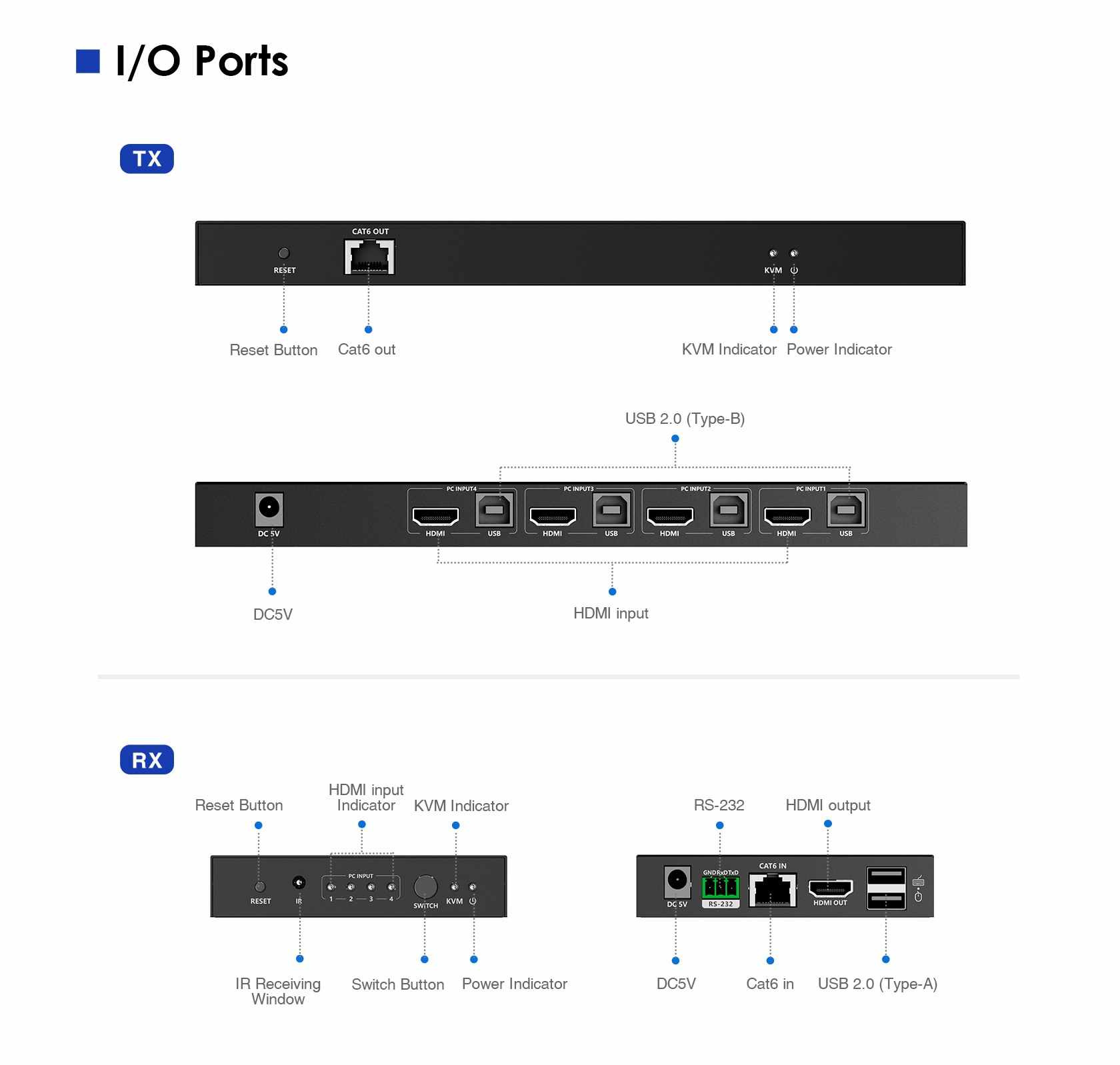 - KVM přepínač (transmitter) se propojí kvalitním kabelem Cat6/7 na vzdálenost až 70m s receiverem