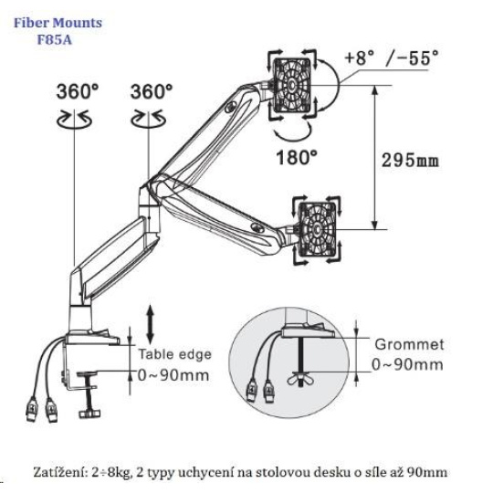 Profesionální kancelářský držák LCD monitoru Fiber Mounts F85A Kancelářský držák na PC monitory 19÷32", nastavení výšky, otáčení, náklon, rotace, korekce roviny, 2 typy uchycení na stolovou desku, USB konektory, systém vedení kabeláže Profesionální stolní držák pro uchycení a polohování PC Lcd monitorů s úhlopříčkou 19 až 32 palců. Držák Vám umožní 3D polohování obrazovky monitoru: otáčení do stran, náklon, nastavení vzdálenosti od stolního uchycení, výškovou polohovatelnost, rotaci monitoru. Držák je osazen USB konektory a má systém pro vedení kabeláže. V balení naleznete 2 typy uchycení na stolovou desku o průměru až 90mm: na kraj stolu nebo do prostoru stolu. Držák podporuje VESA standardy 75x75 a 100x100, v případě potřeby je možné dokoupit rozšíření na 200x100 nebo i 200x200. Zavěsit můžete veškeré monitory a televizory s hmotností 2 až 8kg. Výškovou polohovatelnost zajišťuje plynový píst s nastavitelnou tuhostí - snadná regulace. Profesionální kvalita a krásný design držáku Fiber Mounts F85A umožní použití ve firmách, kancelářích, pracovnách, ale i domácnostech a dětských pokojích. Technické údaje: zatížení 2÷8kg podporuje VESA standardy 75x75 a 100x100 možnost rozšíření VESA na 200x100 nebo 200x200 doporučujeme na monitory a televizory s úhlopříčkou 19 až 32" otáčení do stran +/-90° náklon: nahoru +55°, dolů -8° celková výška 500mm výšková polohovatelnost v rozmezí 295mm maximální vzdálenost od stolního uchycení 572mm funkce PIVOT - rotace monitoru, nastavení horozontální nebo vertikální polohy monitoru korekce roviny monitoru integrované USB konektory součástí balení 2 typy uchycení na stolovou desku: na kraj stolu nebo do prostoru profesionální kvalita snadná nastavitelnost krásný design záruka 2 roky Kancelářský držák na LCD monitory Fiber Mounts F85A podporuje VESA standardy: VESA 75x75 VESA 100x100 možnost dokoupit rozšíření VESA 200x100 možnost dokoupit rozšíření VESA 200x200.
