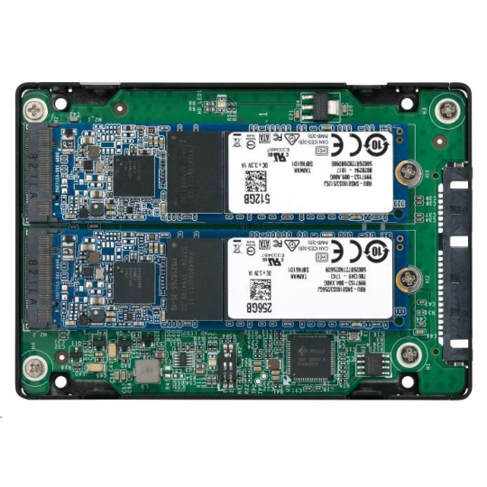 Použijte dva M.2 SATA SSD moduly v jedné 2,5” pozici pro diskové jednotky SATA s podporou RAID pro počítače a NAS