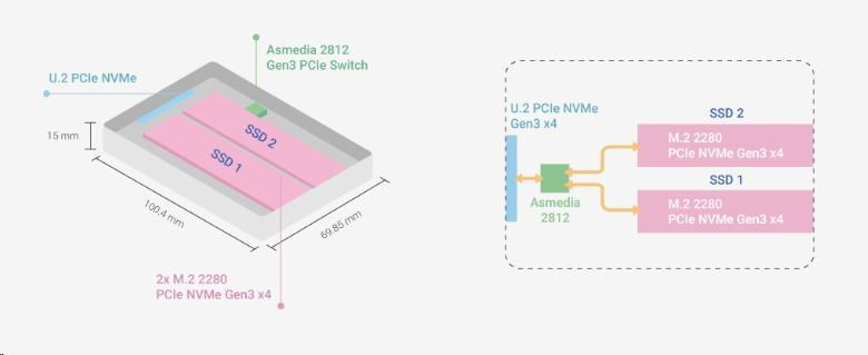 Produkt QDA-U2MP dokáže pojmout dva M.2 PCIe 3.0 x4 NVMe SSD uvnitř jedné 2,5” diskové pozice U.2 (SFF-8639) PCIe 3.0 x4 NVMe SSD. Pro QDA-U2MP není nutný žádný softwarový ovladač a lze jej nainstalovat do počítače/pracovní stanice (Windows®, Linux®) nebo QNAP NAS, kde umožňuje použít místo nákladnějšího U.2 SSD dostupnější M.2 SSD.
