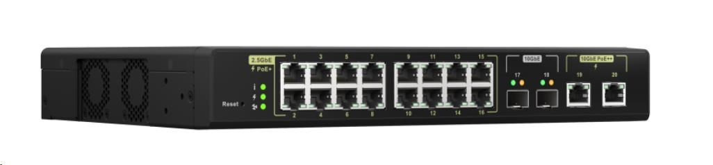 Provedení:Rack mounted 19"; Funkce:QoS (Quality of service), VLAN (virtual local area network), PoE (Power over ethernet), L2, Web management/Smart switch; Technologie:2,5 Gigabit ethernet + 10 Gigabit optika; Přenosová rychlost LAN (Mb/s):2500; Podporované standardy PoE:802.3af, 802.3at, 802.3bt; PoE budget (W):280; Počet PoE Out portů:18.... více