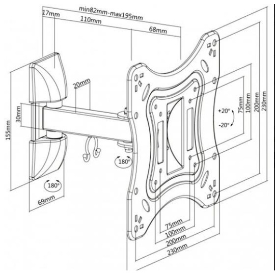 Nástěnný ocelový držák na LCD monitory a TV s uhlopříčkou 23"- 42" (58-107cm) a hmotností maximálně 20kg. 2x pant, vertikálně výklopný +20°/-20° a horizontálně otočný +90°/-90°, vzdálenost od stěny 82-195mm, materiál ocel, barva černá. Uchycení VESA: 75x75, 100x100, 100x200, 200x200..