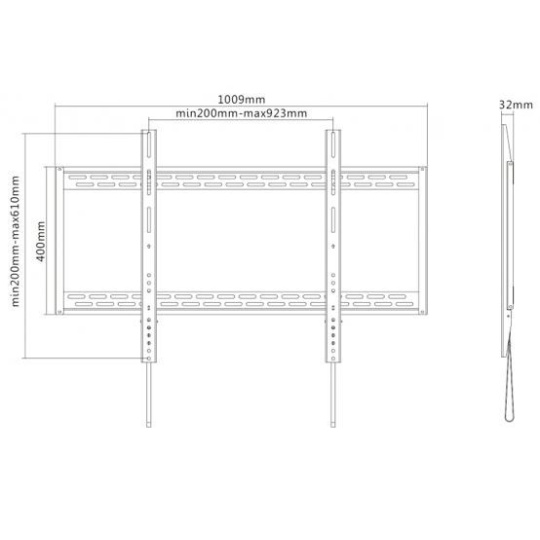 Nástěnný ocelový držák na Plasma a LCD TV s uhlopříčkou 60"- 100" (152-254cm) a hmotností maximálně 100kg. Konzole na zavěšení TV s vodováhou, není vertikálně výklopný, vzdálenost od stěny 32mm, materiál ocel, Click-in system, barva černá. Uchycení VESA: 200x200, 400x200, 300x300, 400x400, 600x400, 800x400, 800x600, 900x600..