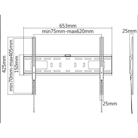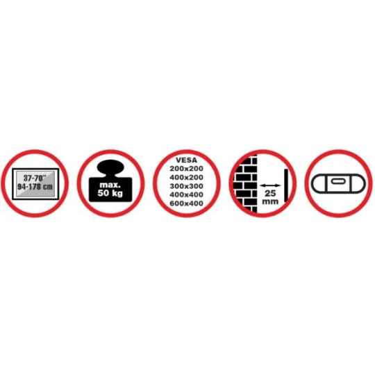 Nástěnný ocelový držák na Plasma a LCD TV s uhlopříčkou 37"- 70" (94-178cm) a hmotností maximálně 50kg. Konzole na zavěšení TV s vodováhou, není vertikálně výklopný, vzdálenost od stěny 25mm, materiál ocel, cenově výhodné, barva černá. Uchycení VESA: 200x200, 400x200, 300x300, 400x400, 600x400..