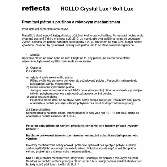 Roletové plátno SOFTLIFT CrystalLine 240x240cm s brzdou, viditelná plocha 1:1, 131"/334cm, 236x236cm, bílý hranatý kovový tubus 7x255cm/13kg, uchycení na stěnu/strop, materiál BetaLux - bílá 0,35 tkanina 300g/m2 s 2cm černým okrajem a zadní stranou, Gain=1,0, pozorovací úhel 120°. Lux - bílý matný povrch pro maximálně věrný a kontrastní obraz při alespoň částečném zatemnění. PVC materiál s textilním základem vytváří rovnou plochu bez zvlnění ale v krajích může docházet k prohnutí - postupně mizí. Snadné uchycení 4 vruty na plastových bocích plátna - stěna nebo strop. Možnost aretace polohy plátna při každé otáčce mechanizmu. SOFTLIFT mechanika brání prudkému zpětnému navinutí plátna a zároveň usnadňuje aretaci v požadované poloze. Ideální pro školy nebo místa, kde hrozí nesprávná manipulace s běžným ROLLO plátnem..