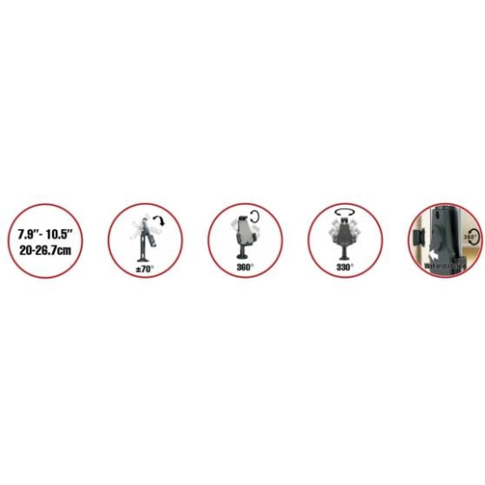 Bezpečnostní uchycení pro tablety 7,9-10,5" na stůl a na stěnu. Nastavitelný sklon tabletu rozmezí +70/-70° a navíc otočný 360°, fixace vruty ke stolu - 330° otočné kolem osy, hmoždinky do zdi, ocelové lanko proti odcizení, kabelový prostup, černý..