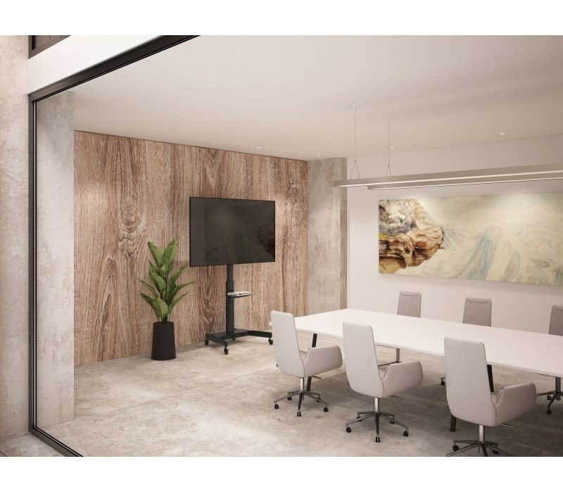 Televizní stolek na velké TV s uhlopříčkou 32"- 65" (81-165cm) a hmotností maximálně 35kg. Středový nosný profil 120-160cm na kolečkách s aretací, držák vertikálně výklopný +0°/-10°, police 33x43cm max 5kg, Cable managment, rozměry 87x63x142cm, materiál alu/ocel, barva černá. Uchycení VESA: 200x200, 300x200, 300x300, 400x200, 400x400, 600x400..