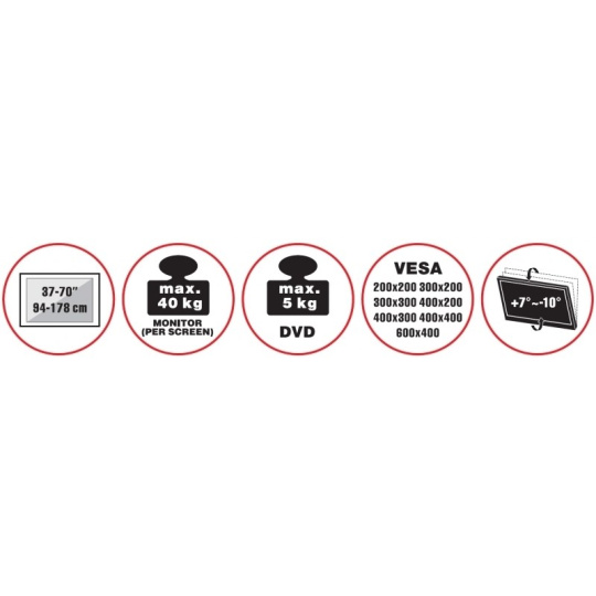 Designový stolek na velké LCD TV s uhlopříčkou 37"- 70" (94-178cm) a hmotností maximálně 40kg. Středový nosný profil 111,5-141,5cm na elegantní základní desce, držák výklopný +7°/-10°, polička 30x35cm max 5kg, ocelová konstrukce až ke zdi, rozměr 70x52x161,8cm, barva černá. Uchycení VESA: 200x200, 300x200, 300x300, 400x200, 400x300, 400x400, 600x400..
