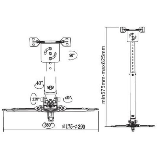 Stropní držák na dataprojektory - vzdálenost od stropu 57,5-82,5cm, přístroj lze otočit o 360° a naklonit +/-20°, maximální zatížení 20kg, možnost naklopení nosné tyče - vhodné na šikmé plochy, stříbrný. Univerzální systém uchycení dataprojektorů (rozsah 16-33 cm)..