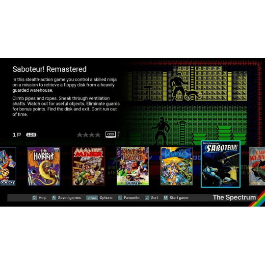 48 zabudovaných her včetně Manic Miner, The Hobbit a Head Over Heels
