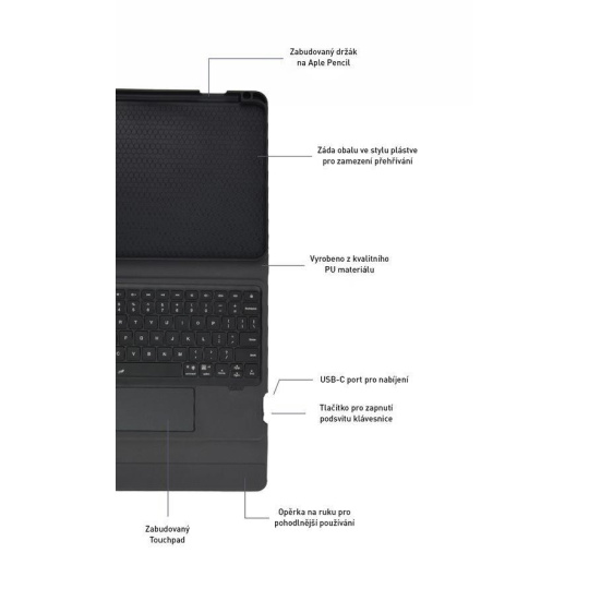 Velikým benefitem je zabudovaný touchpad, díky kterému si při práci vystačíte i bez myši. Mezi další skvělé vlastnosti patří RGB podsvícená klávesnice s možností regulací / vypnutí / zapnutí podsvitu, záda krytu s odvodem tepla a integrovaný držák na Apple Pencil. Pouzdro jednoduše použijete i jako stojánek při práci na stole, a naopak v zavřeném režimu udrží pouzdro zavřené silný magnet.