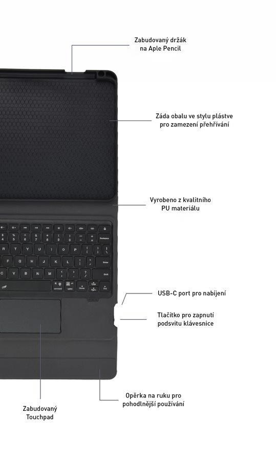 Velikým benefitem je zabudovaný touchpad, díky kterému si při práci vystačíte i bez myši. Mezi další skvělé vlastnosti patří RGB podsvícená klávesnice s možností regulací / vypnutí / zapnutí podsvitu, záda krytu s odvodem tepla a integrovaný držák na Apple Pencil. Pouzdro jednoduše použijete i jako stojánek při práci na stole, a naopak v zavřeném režimu udrží pouzdro zavřené silný magnet.