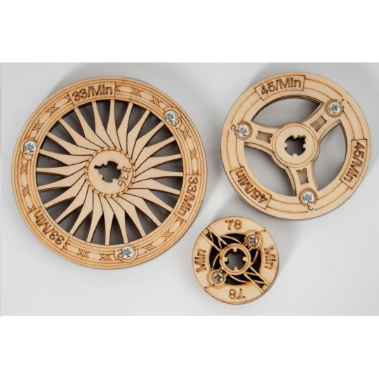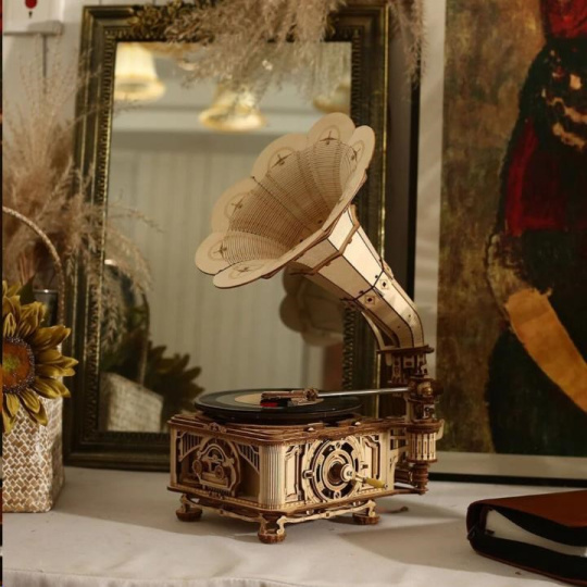 Jak zní historie? Stavebnice gramofonu z překližky. Retro designem, inspirovaným gramofonem vynalezeným Thomasem Edisonem, Vás přenese do 19. století. Není to jen model, skutečně umí přehrávat desky a je k němu i dodávána 7" gramodeska obsahující trojici písní (The Merry Gent, Memory Of A Dance, The Giant Killers). Zařízení disponuje ručně, klikou, poháněnou mechanikou a dynamem. Je možné jej ale pohánět i elektricky, pomocí vestavěného micro-USB konektoru. Podporuje desky o rozměrech 17,5 cm (7") a 25 cm (10") a všechny jim odpovídající rychlosti přehrávání. Hlasitost reprodukce lze upravovat pomocí otočného ovladače. Jedinečný dárek pro všechny milovníky kutilství a hudby, ale také luxusní interiérová dekorace do pokoje či kanceláře. Skládačka je dodávána v nesloženém stavu, balena v krabici. Vybaveno detailním návodem k sestavení.
