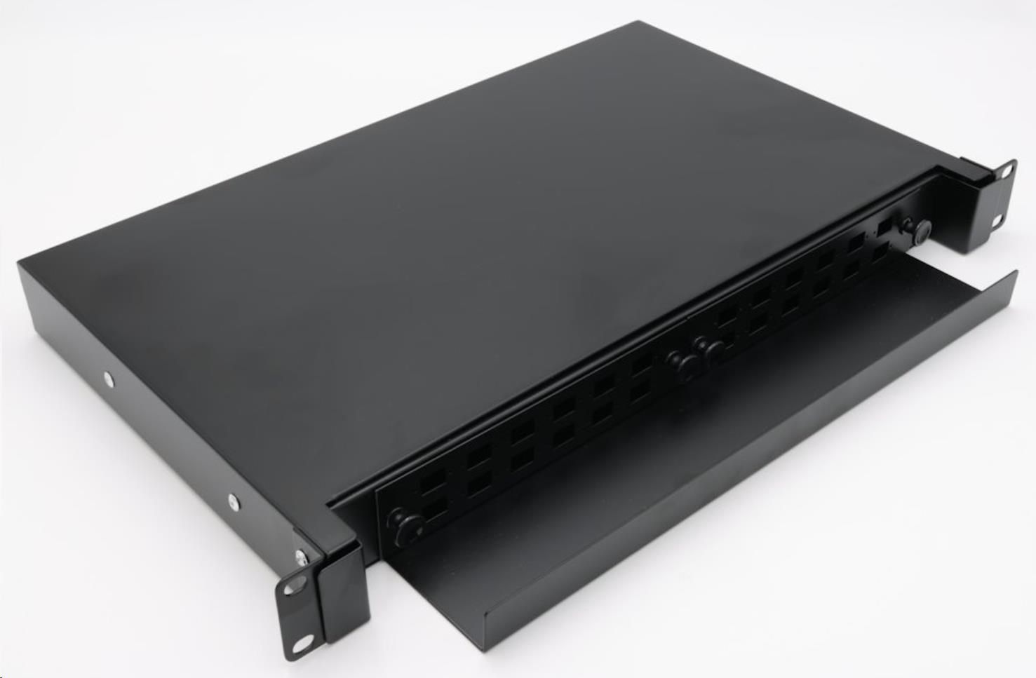 19" rozvaděč, výška 1U, pro 24 simplex adaptérů SC nebo duplexních LC, barva černá, kovová skříň, kazeta na svarky. Vana se vysouvá pomocí pojezdových kolejnic.