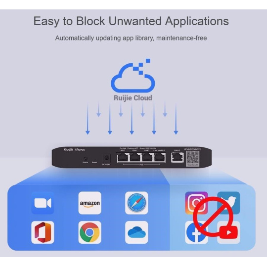 Registrace dealerské ceny: https://docs.google.com/forms/d/1sWwsswsbBk36eZx4CJrfl47qUvrORQyYz7kMjrt2f_c/prefill Popis produktu Ruijie RG-EG105G V2 je kabelový Gigabitový router s VPN vhodný do domácností i malých firem. Bezpečný a spolehlivý router s vlastním webovým managementem, možností správy přes Ruijie Cloud odkudkoliv a kdykoliv ale také blokováním obsahu na základě typu služeb z automaticky updatovaného seznamu nebo URL, inteligentní Multi-WAN load balancing a captive portál. Router disponuje 2 Gigabitovými WAN porty z čehož jeden je LAN/WAN, 3 Gigabitovými LAN porty a celkovým výkonem v NATu 600 Mbps. Router pro přístup do lokální sítě umožňuje nastavení i několika možností VPN serverů a to konkrétně: IPsec, PPTP, L2TP a OpenVPN. Obsah balení • Zařízení • Napájecí adaptér 12V Technické parametry Konektory a rozhraní Možnost více WAN:Ano Rychlost LAN:(3) 10/100/1000Mbps + (1) 10/100/1000Mbps LAN/WAN Gigabit LAN:Ano Napájení Typ napájení:DC konektor Max. spotřeba energie [W]:6 Napájení přes konektor/svorkovnici:12V DC Fyzické charakteristiky Provedení:Desktop Ventilátory:Bez ventilátoru Šasi:Kovové Tlačítka:Reset Provozní teplota [°C]:0 až 40 Šířka [mm]:207 Výška [mm]:28 Hloubka [mm]:109 Hardware CPU:Dual Core Frekvence CPU [MHz]:880 Počet CPU jader:2 RAM [MB]:128 Obecné Propustnost NAT [Mb/s]:600 Software Podporované VPN:PPTP, L2TP, IPSec, OpenVPN.