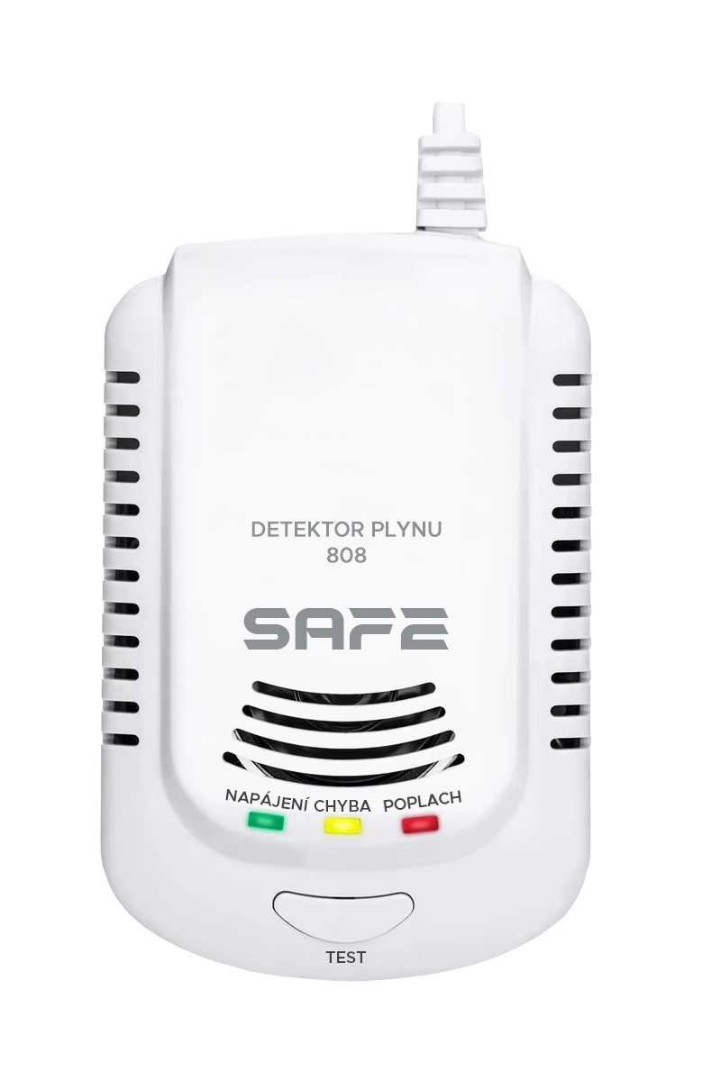 Detektor je vybaven tlačítkem TEST s funkcí, která slouží k umělému simulování přítomnosti plynu a umožňuje ověření provozuschopnosti vnitřních obvodů prostřednictvím automatického monitorovacího systému účinnosti.Hlásič plynu SAFE - 808 se ideálně hodí pro detekci úniku plynu ze všech domácích plynových spotřebičů a plynových kotlů. Detekuje všechny hořlavé plyny běžně se vyskytující v domácnostech.