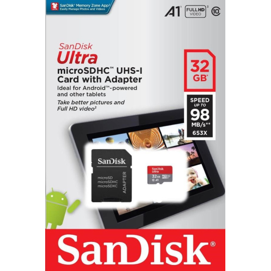 SanDisk MicroSDHC karta 32GB Ultra (120MB/s, A1 Class 10 UHS-I, Android - Tablet Packaging, Memory Zone App) + adaptér