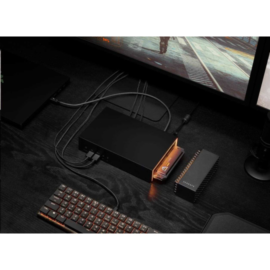 Hrajte tvrději s Seagate® FireCuda® Gaming Dock, elitním 4TB úložným hubem, který propojuje celou stolní bitevní stanici – klávesnici, myš, USB sluchátka, webovou kameru, monitor displeje a další – prostřednictvím jednoho kabelu Thunderbolt 3. Zapojte jej do notebooku a použijte rozšiřitelný slot M.2 NVMe pro práci s upgradem FireCuda 510 NVMe SSD pro přeplňované spouštění aplikací a doby načítání. Je dokonce vybaven přizpůsobitelnými RGB LED světly pro rovnoměrné osvětlení.