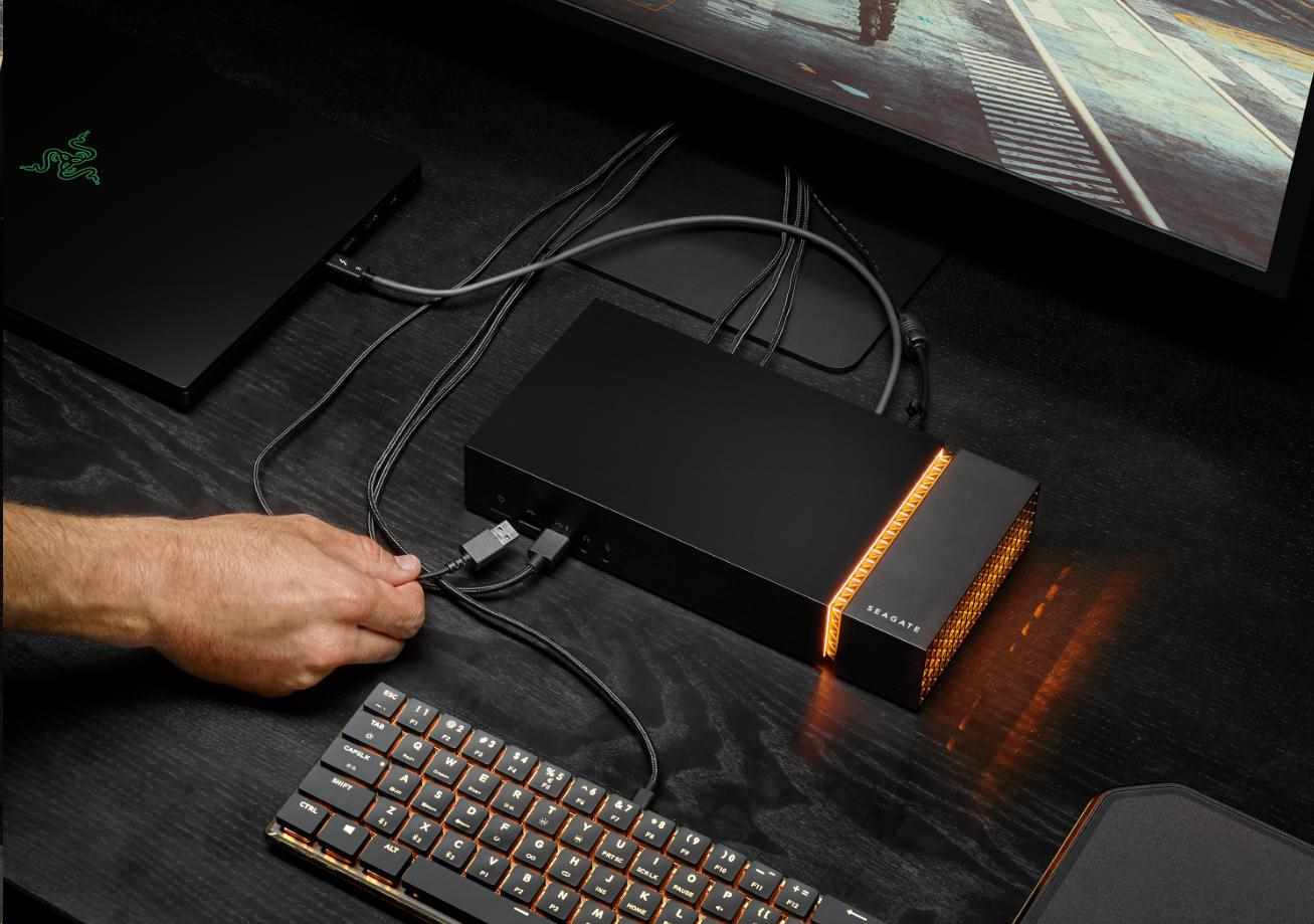 Hrajte tvrději s Seagate® FireCuda® Gaming Dock, elitním 4TB úložným hubem, který propojuje celou stolní bitevní stanici – klávesnici, myš, USB sluchátka, webovou kameru, monitor displeje a další – prostřednictvím jednoho kabelu Thunderbolt 3. Zapojte jej do notebooku a použijte rozšiřitelný slot M.2 NVMe pro práci s upgradem FireCuda 510 NVMe SSD pro přeplňované spouštění aplikací a doby načítání. Je dokonce vybaven přizpůsobitelnými RGB LED světly pro rovnoměrné osvětlení.