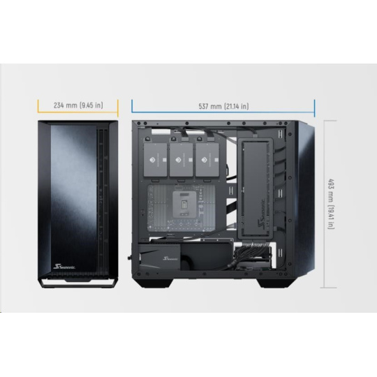 The state-of-the-art Seasonic SYNCRO Q7 Series is a mid-tower ATX chassis that features an aluminum body and a tempered glass panel on one side and the Seasonic SYNCRO CONNECT Module on the other. This setup can accommodate powerful hardware and provides versatile cooling and ventilation options. The SYNCRO CONNECT Module functions as a cable management hub, to which the components are directly connected with generally shorter cables. This setup simplifies cable routing and allows for a clean look on both sides of the case.