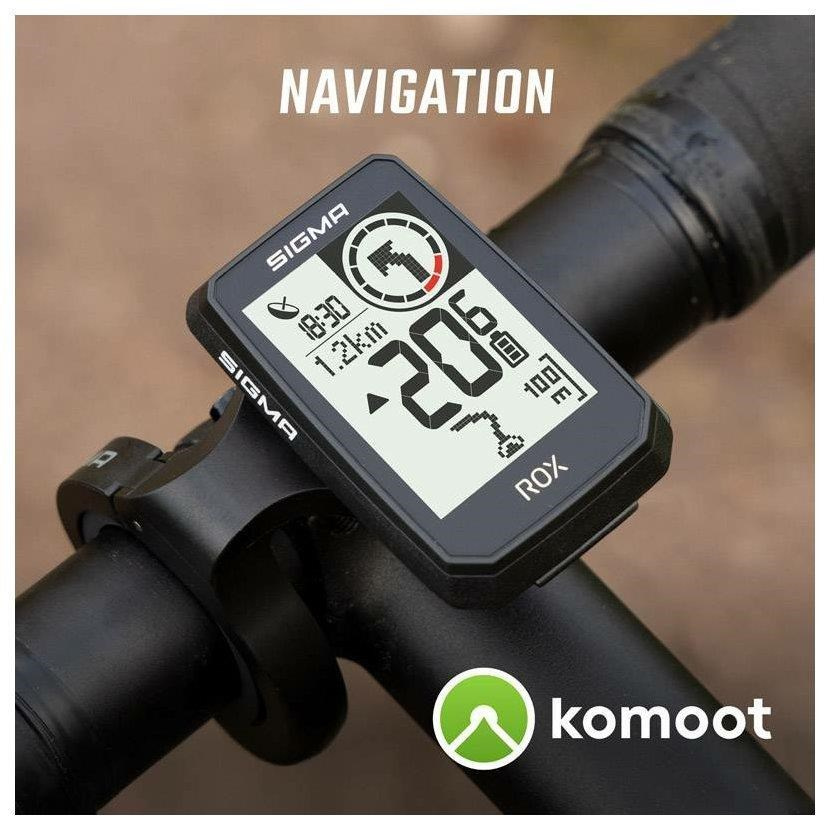 Během navigace se na displeji ROX 2.0 Endurance zobrazuje trasa a pokyny pro odbočení "Turn-by-Turn". Odbočovací šipka a akustický signál ukazují další odbočku. Abyste odbočku nepřehlédli, odpočítává červený kruh pomocí barevných pruhů vzdálenost do další odbočky. Ty se zmenšují, čím blíže jste k odbočce. Pokud se spontánně odchýlíte od navržené trasy, zařízení ROX v součinnosti s aplikací SIGMA RIDE rychle naplánuje novou trasu do cíle.
