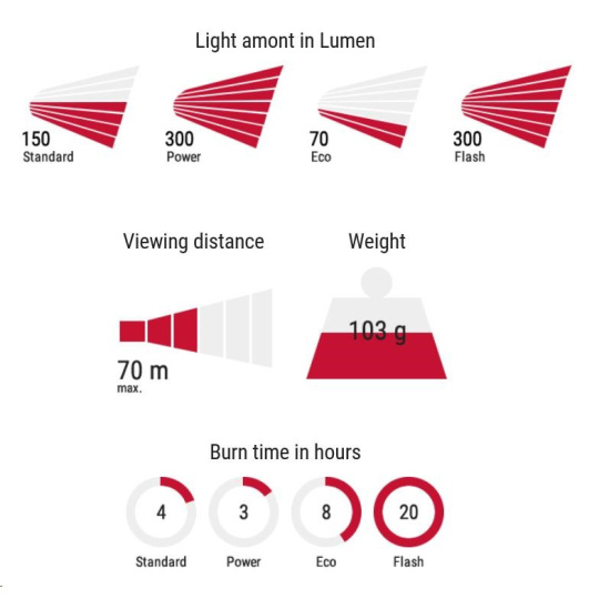Se čtyřmi různými režimy může být intenzita osvětlení optimálně přizpůsobena. Světlo má 3 režimy svícení: intenzivní 300 lm / standardní 150 lm / ekonomický 70 lm a režim blikání.