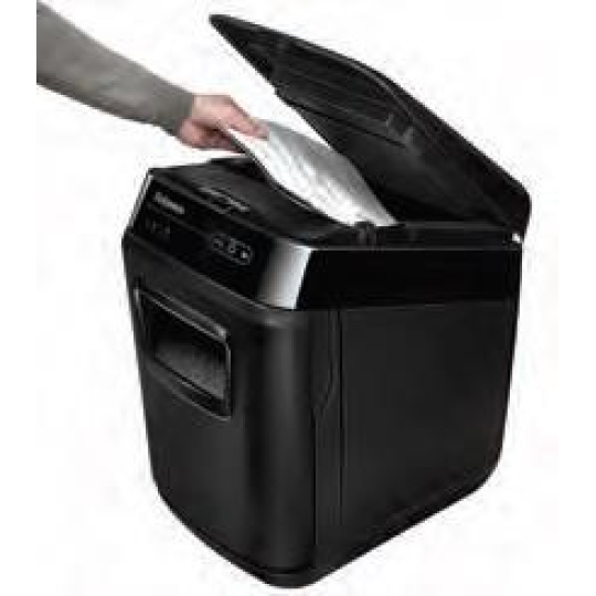 Skartování nikdy nebylo snazší. Revoluční novinka značky Fellowes, Vás o tom přesvědčí. Jen nalož, zapni a běž. Tento automatický skartovací stroj Vám umožní věnovat se prospěšnějším kancelářským činnostem, nežli je opakované postávání u běžného skartovače. Zařízení je schopno na jeden pracovní cyklus při automatickém podávání skartovat až 200 listů 70g papíru v křížovém řezu 4×38 mm. Skartovač je vybaven vstupní štěrbinou pro ruční podání až 10-ti listů papíru. Výkonný řezací mechanismus zpracuje při automatickém podávání sešívačkou sešité papíry (až 20 sponkou sešitých listů 70g papíru). Při manuálním podávání i kreditní karty, CD/DVD.