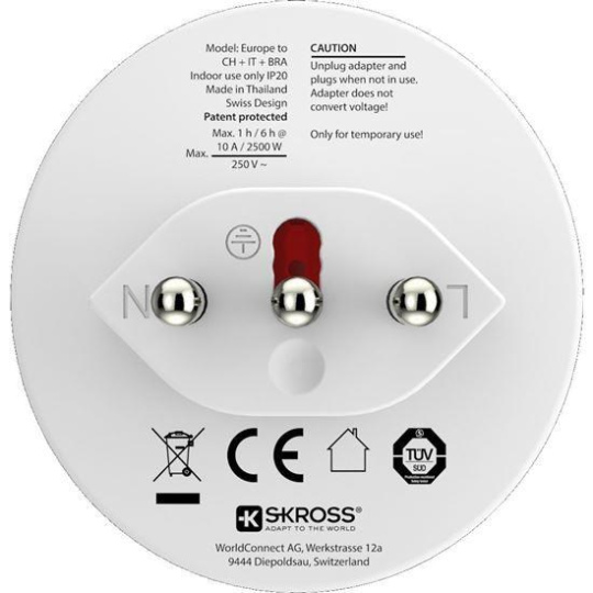 SKROSS cestovní adaptér pro použití v Brazílii, Itálii a Švýcarsku, typ J/N/L
