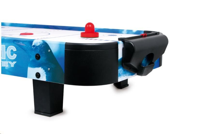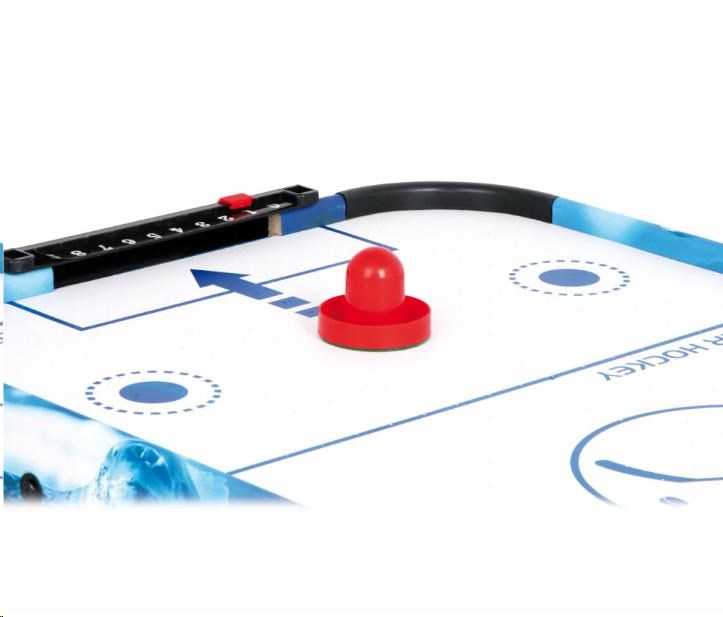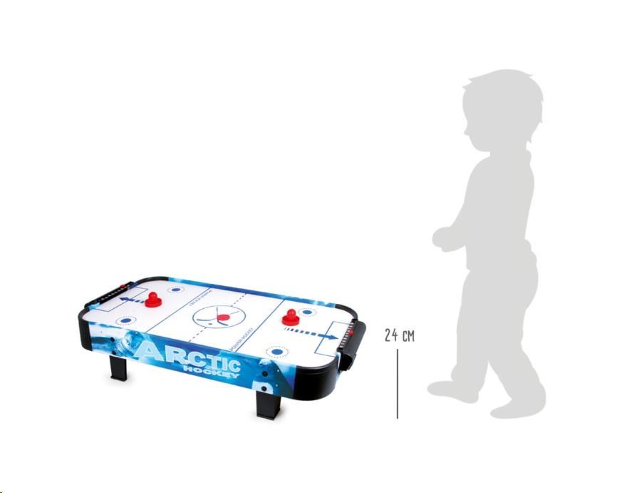 Populární vzdušný hokej prověří postřeh a hbitost dětí. Díky vzduchu vháněnému zespodu vestavěným ventilátorem může puk hladce, ale hlavně bleskurychle klouzat po hrací ploše. Hráči mají k dispozici kuželové pálky, kterými se snaží vstřelit puk do soupeřovy branky. Pálky jsou na spodních stranách opatřeny plstí pro snadný a bezhlučný pohyb. Branka každého z hráčů je vybavena jednoduchým číselníkem k zaznamenávání průběhu zápasu. Hru lze díky její velikosti snadno uklidit, přenášet, nebo i vzít na cesty. Napájení je zajištěno adaptérem se standardní eurozástrčkou pro 220–240 V. Výrobek vyžaduje montáž, dodáváno s obrázkovým návodem k sestavení.
