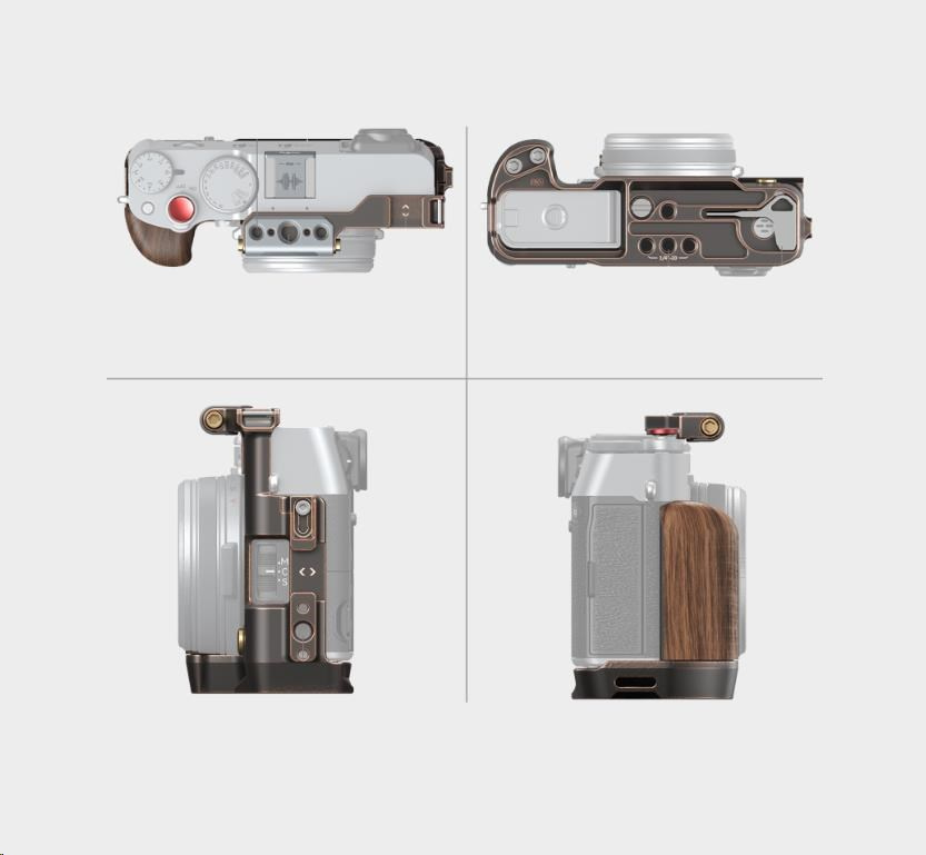 Klec v retro stylu se k fotoaparátu připevňuje pomocí šroubu 1/4"-20 na spodní straně a jednoho bočního zámku na levé straně a silikonové podložky zabraňují poškrábání.