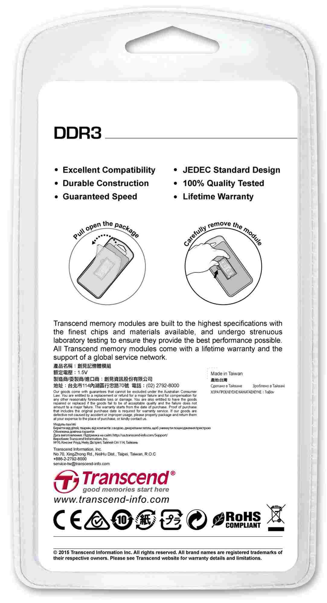 Engineered from the ground up specifically for use in portable computers, Transcend™s notebook modules use the highest grade, brand-name DRAM chips available, which are selected only after passing of our stringent performance and stability evaluation, including rigorous testing in extreme environments. These compact memory modules offer an unrivaled level of compatibility and stability that far outclasses the competition. Suitable for use in notebooks of virtually every brand and type, Transcend memory modules are at the heart of many high-quality, extremely reliable computers. Moreover, to assure ultimate cross-platform compatibility and stability, each module is tested in many different system configurations that include mainstream notebooks and popular software programs.