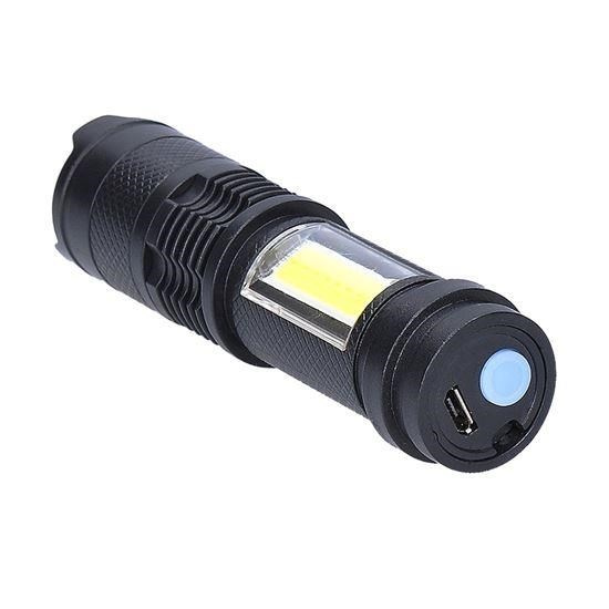 nabíjecí LED kapesní svítilna s USB konektorem svítivost: 100lm + 70lm (přední + boční) 3 režimy svícení: 100% přední , přerušované (blikání) přední, 100% boční outdoorové užití (stupeň krytí IP44) nastavitelný kužel světla (zoom) výdrž baterií min/max: 1hod./2hod. doba nabíjení: 2hod. baterie: 3.7V 400mAh Li-Ion napájení: USB konektor rozměry: 100 x 26mm barva: černá balení: display box 6ks.