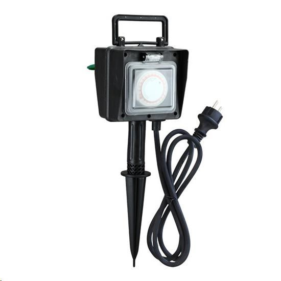 plastový sloupek s elektrickými zásuvkami a časovým spínačem přenosný přívod elektrické energie do zahrad a sadů 2 zásuvky s krytkami proti vlhkosti a prachu časový spínač mechanický 24h, min. časový úsek 15min hrot k zapíchnutí do země gumový kabel 3x 1,5mm2, typ H05RR-F3 délka: 1,5m barva: černá, zelené kryty zásuvek třída ochrany: IP44.
