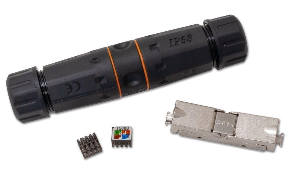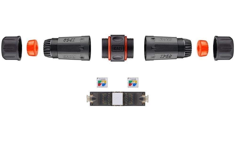 Propojovací stíněná voděodolná spojka pro rozvody Cat5e/6/6a. Určeno pro prodloužení segmentů okonektorovaných kabelů. Vhodná pomůcka pro exteriérové instalace aktivních outdoor prvků, a jejich snadnou montáž a demontáž v hůře přístupných místech.