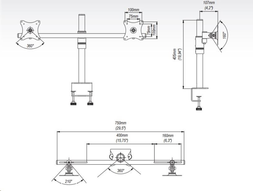 Technické údaje: max. zatížení 20kg na monitory a tv o úhlopříčce 17" až 27" VESA standart 75x75 a 100x100 nezávislé nastavení každé obrazovky náklon nahoru i dole +/- 60° otáčení do stran +/- 90° posun obrazovky v ose držáku - nastavení vzdálenosti mezi monitory výška držáku 405mm nastavení požadované výšky dle potřeby volba typu uchycení dle vaší potřeby volitelná barva - černá nebo stříbrná záruka 5 let.