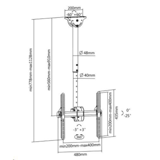 Stropní držák televize Fiber FN-T400 Stropní držák na Tv 32-60" plně polohovatelný, TOP kvalita Držák pro zavěšení televizorů a monitorů na stropní konstrukce. Držák je plně nastavitelný: otáčení do stran, náklon, délka od stropu, korekce roviny, i na šikmé stropy +/-60°, možnost kolmého otočení úchytu a instalace i na svislé plochy. Celoocelová konstrukce s vynikající pevností, možnost zavěsit televizory s hmotností i 50kg. Top kvalita, plná nastavitelnost, spolehlivost a bezpečnost, to jsou hlavní přednosti tohoto stropního držáku na televizory a monitory. Profesionální stropní držák na televize i monitory 32-65 palců, otočný do stran, možnost velkého náklonu, délkové nastavení, systém skrytého vedení kabeláže, nosnost 50kg. Stropní držák Tv Fiber FN-T400 Technické údaje: nosnost 50kg podpora VESA 200x100 až 400x400 na televize a monitory s úhlopříčkou 32" až 60" (dle VESA a hmotnosti i větší) nastavení délky držáku 560mm až 910mm otáčení do stran +/- 180° náklon 0° až -25° korekce roviny obrazu +/- 3° možnost zavěšení na vodorovné i na šikmé stropní konstrukce +/- 60° možnost zavěšení i na svislé plochy ocelová konstrukce výborné kvality systém pro skryté vedení kabeláže barevné provedení černé záruka 5 let Stropní držák na televize a monitory Fiber FN-T400 podporuje VESA standardy: VESA 200x100 VESA 200x200 VESA 300x100 VESA 300x200 a 200x300 VESA 300x300 VESA 400x200 a 200x400 VESA 400x300 a 300x400 VESA 400x400.