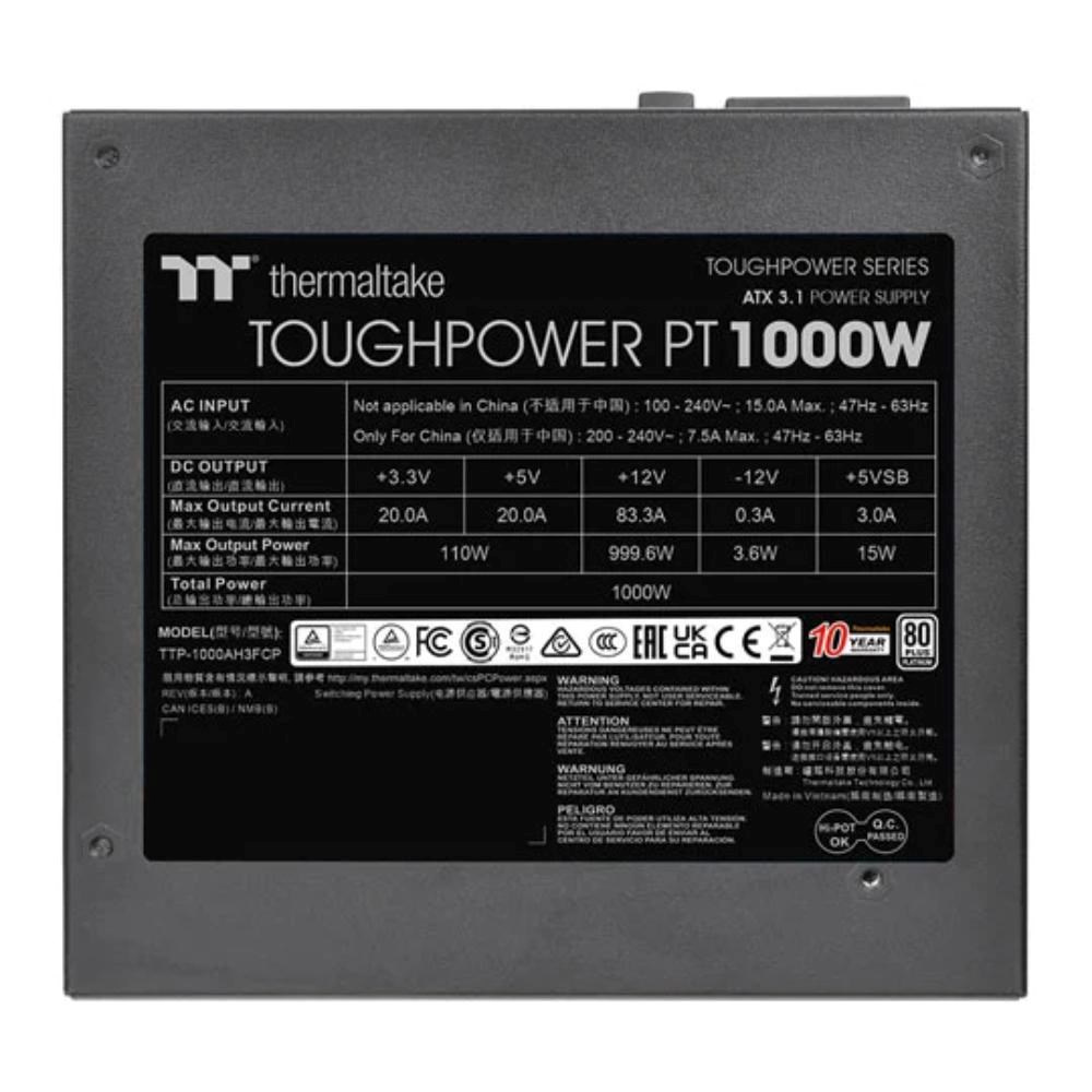 Toughpower PT 1000W Platinum je kompatibilní s ATX 3.1, má certifikaci 80 PLUS Platinum a podporuje nativní PCIe Gen 5.1 (12+4pin) pro napájení nové generace grafických karet. Poskytuje 1000 W nepřetržitého výkonu při 40 °C.