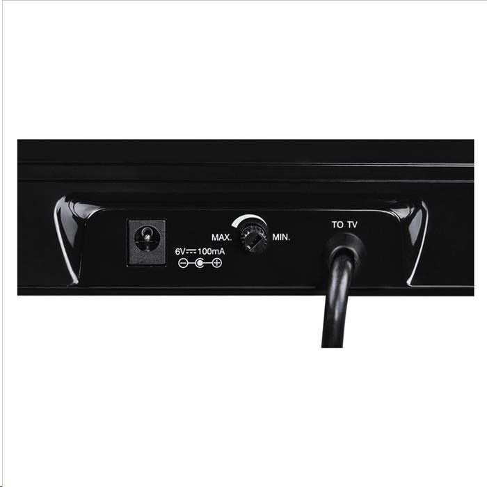 - stylová anténa pro příjem digitálního televizního (DVB-T/DVB-T2) i rozhlasového (DAB/DAB+) vysílání - integrovaný zesilovač s regulací - decentní modrá provozní kontrolka integrovaná do průsvitného proužku - pevně připojený anténní kabel (délka 1,5 m) - napájení přes síťový adaptér (součást balení, délka kabelu 1,8 m) nebo z přijímače po anténním kabelu (5 V) - síťový vypínač na kabelu adaptéru pro úsporu energie - frekvenční rozsah: 174-230 MHz / 470-790 MHz - kategorie: Performance 45* (orientační dosah 25 km) - rozměry: 26 x 13,5 x 7,5 cm - barva: lesklá černá *Informace: Nová směrnice 2014/53/EU, známá jako "RED", se zabývá uvolněním původně televizního vysílacího pásma ve prospěch sítí mobilní komunikace. Mimo jiné také omezuje u aktivních antén (nově uvedených na trh) uváděné zesílení v decibelech dB. Maximální povolená hodnota je 20 db (dBi), protože vyšší hodnoty nejsou reálně využitelné a jsou zavádějící. Proto Hama rozděluje nové antény do kategorií "Performance xy", kde xy je číslo, vyjadřující příjmové schopnosti a vybavení/funkce antény (vyšší číslo = lepší anténa). Pro lepší orientaci jsou čísla zvolena tak, aby alespoň přibližně odpovídala původně uváděnému zesilení v dB..