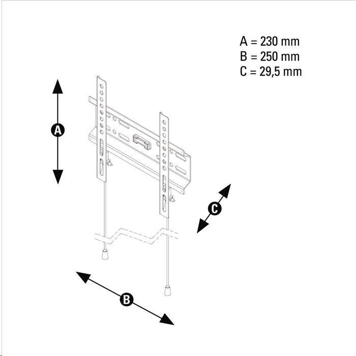 - fixní držák pro LCD obrazovky s úhlopříčkou cca 10" až 46" (25 až 117 cm) - VESA max. 200x200, nastavitelná ramena pro jakoukoliv menší rozteč závitů - snadné zavěšení TV pomocí dvou ramen - max. velikost upevňovacích závitů na TV: M8 - rozměry nástěnného modulu: 25 x 10 cm - hloubka: 3 cm - nosnost: max. 30 kg - kategorie: 1* (základní řada) - barva: černá - včetně vodováhy a montážního příslušenství.