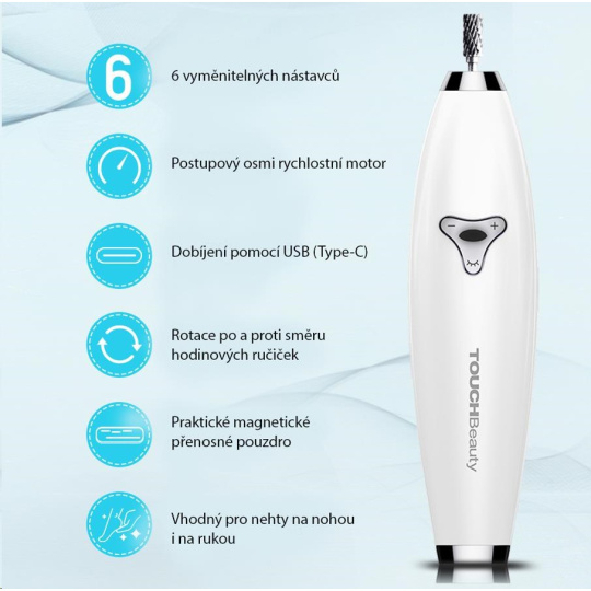 Sada na manikúru a pedikúru TOUCHBeauty 1733 je vhodná pro tvarování, opravy, broušení, leštění a vyhlazování nehtů. Nabízí dokonce 6 různých nástavců, vysoký výkon až 12 000 ot./min., který se nastavuje v 8 rychlostních stupních, a cestovní magnetické pouzdro na nástavce. Kombinace integrované baterie a USB nabíjení přispívá k Vašemu pohodlí a zároveň představuje ekologičtější variantu k přístrojům, které používají tužkové baterie. Díky obousměrné 360° rotaci je bruska vhodná pro praváky i leváky.