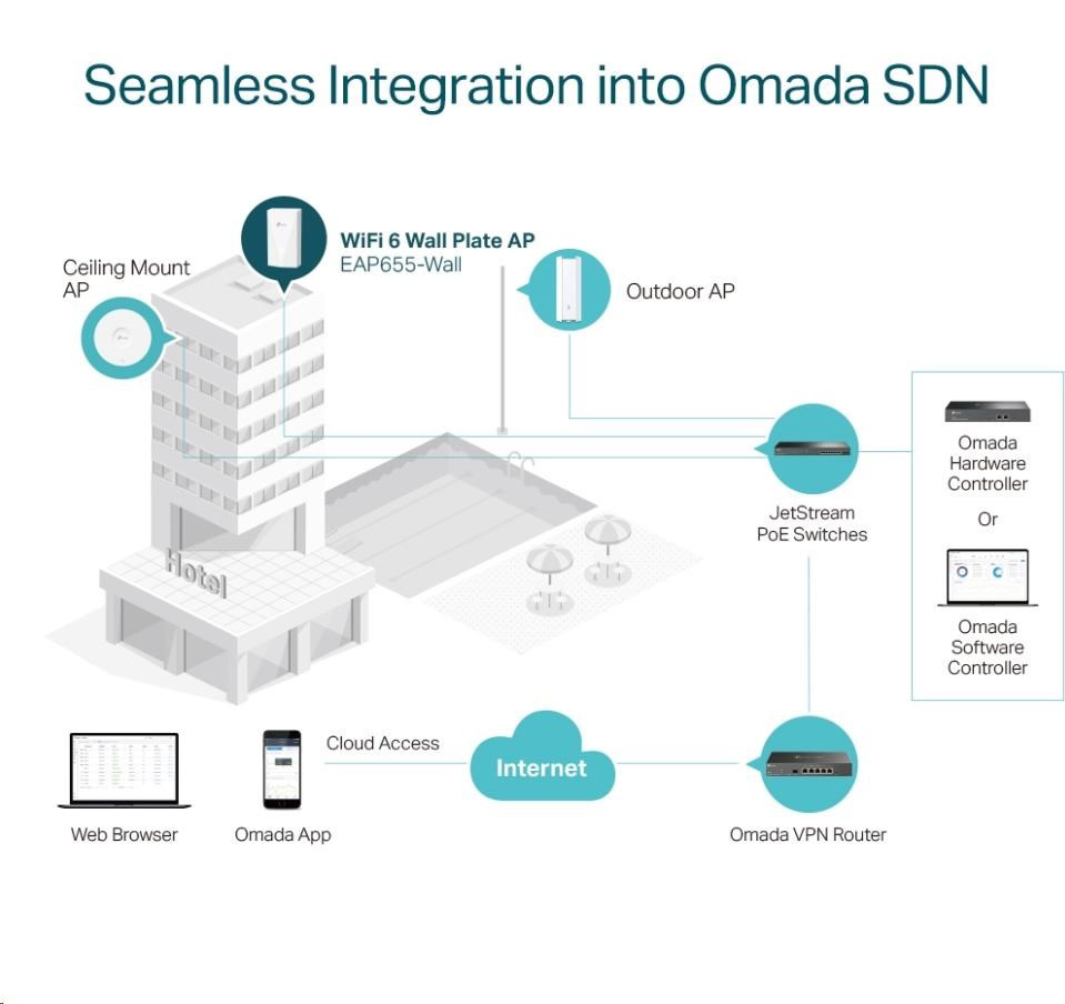 - Centralizovaná cloudová správa: Integrace s platformou Omada SDN umožňuje cloudový přístup a vzdálenou správu.