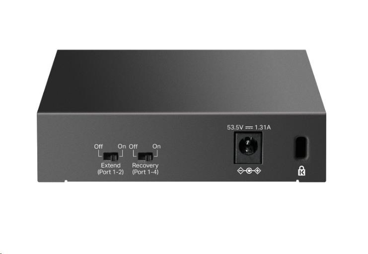 | Advanced Features | • Extend Mode Button (Ports 1–2, Up to 250 m PoE power supply and data transmission) • PoE Auto Recovery Button (Ports 1-4) • Compatible With IEEE 802.3af/at Compliant PDs • Mac Address Auto-Learning and Auto-Aging • IEEE 802.3x Flow Control • 802.1p/DSCP QoS • IGMP Snooping • Green Technology |