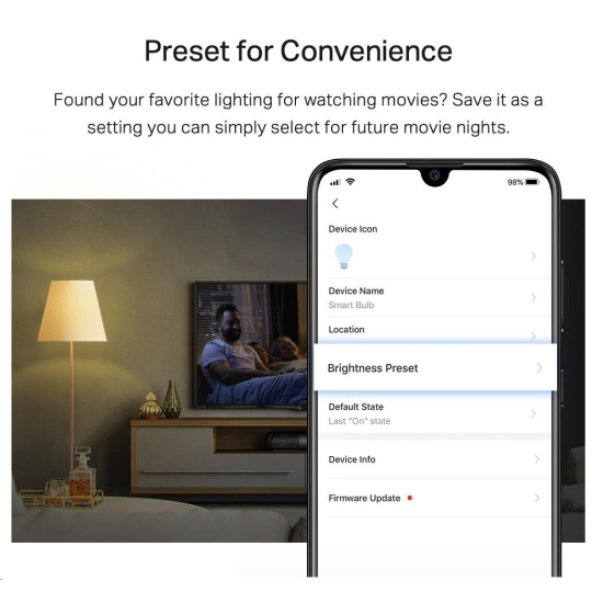 - Stmívatelná (nastavení pro vaše pohodlí) – Našli jste své oblíbené osvětlení pro sledování filmů? Uložte jej jako nastavení, které si můžete jednoduše vybrat pro budoucí filmové noci.