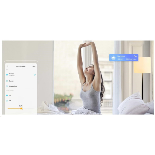 - Časový plán (nastavte si časy) – Vytvořte si pravidelný plán pro zapnutí/vypnutí s nastaveným jasem.