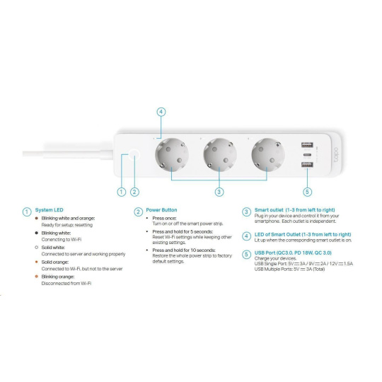 • Individuální kontrola – ovládejte samostatně 3 chytré zásuvky napájecí vícenásobné zásuvky prostřednictvím aplikace nebo hlasových příkazů.